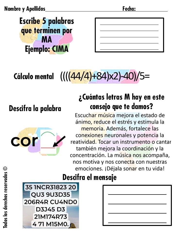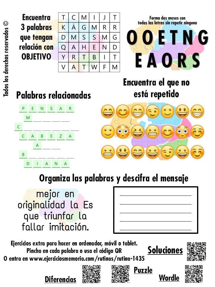 Es una herramienta compuesta de unos 120 ejercicios, en 40 hojas, elaborada por profesionales sociosanitarios especialistas en Estimulación Cognitiva. Estos ejercicios van dirigidos a personas que quieren estimular sus capacidades cognitivas para prevenir o frenar su posible deterioro. Este artículo es un archivo descargable.